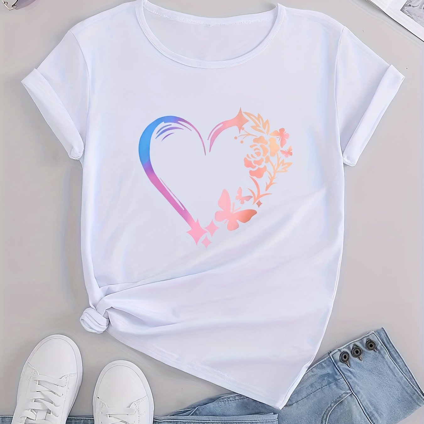 TEMU 하트 & 나비 프린트 캐주얼 티셔츠, 라운드 넥 반팔 소프트 스포티 티, 여성 의류