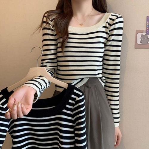 [셀럽하우스]스퀘어넥 USUK9114 스트라이프니트 줄무늬티 단가라니트 니트티