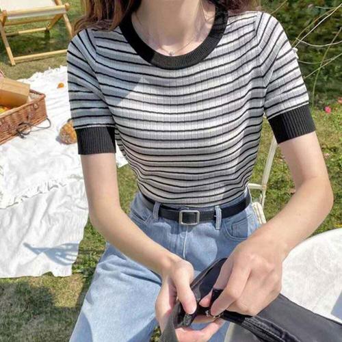 [셀럽하우스]여성 WHIR8581 데일리 봄 여름 반팔티셔츠 니트티 스트라이프티