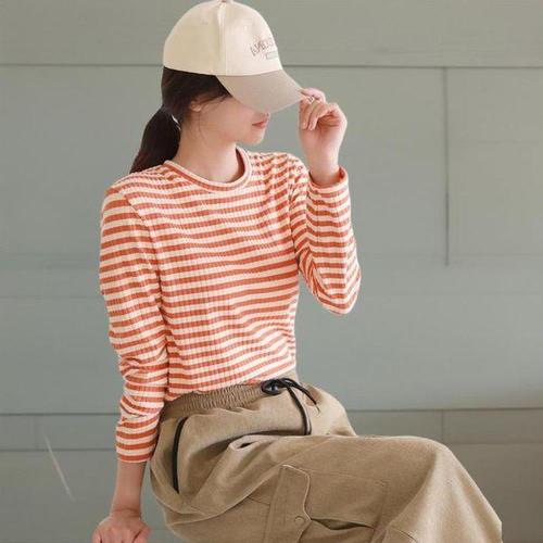 여성용 스트라이프 디자인 라운드넥 긴팔 티셔츠 슬림핏 몸매 봄 가을 인테리어 언더웨어 다양한 용도 활용 가능 세련 패턴 캐주얼 데일리룩 포멀 1+1
