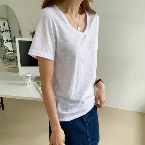 여성 베이직 브이넥 슬라브 면 국산 긴팔 티셔츠 DAI-WSH-1056-화이트