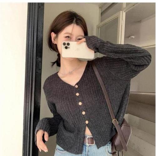 [셀러허브_여성트랜드패션]여성 세미크롭 가디건 골드 버튼 니트 골지 슬림핏