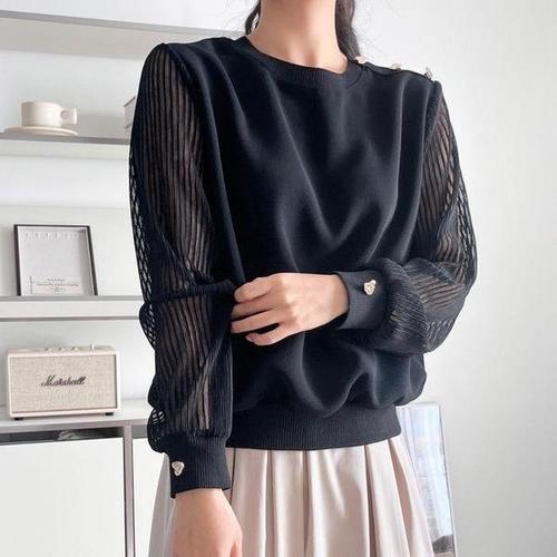 [셀러허브_여성트랜드패션]여자 하트버튼 시스루 플리츠긴팔 봄 블라우스