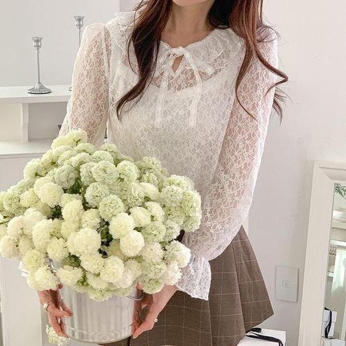 [셀러허브_여성트랜드패션]여자 시스루 플라워자수 리본 봄 블라우스