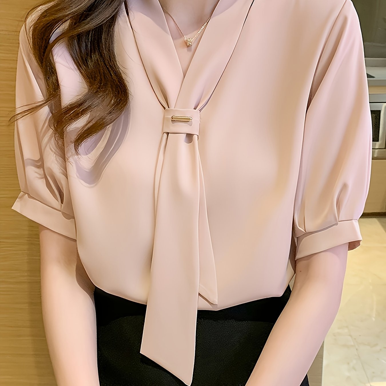 TEMU 여성용 시크한 리본 타이 디테일 쉬폰 블라우스 - 가벼운 슬림핏 반팔 사무실 캐주얼 셔츠, 100% 폴리에스터 기계 세탁 가능 사계절 탑