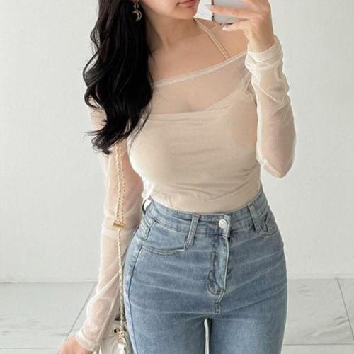 [신상오픈런]여성 시스루 오프숄더 홀터넥 레이어드 롱슬리브 티셔츠