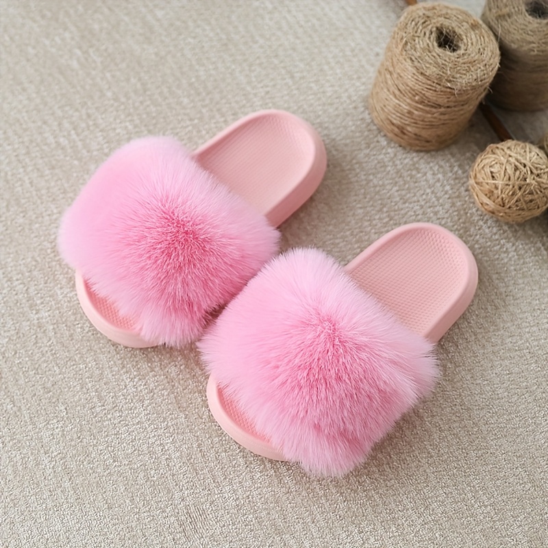TEMU 소녀 & 소년용 EVA 안감과 아치 지원이 있는 플러시 슬립온 슬리퍼 - 사계절형 이너하우스슈즈, 핑크/블랙/화이트/베이지색, 부드러운 상단과 수납된 깔창으로 편안한 홈웨어를 위한 - 귀여운 털복숭이 외관의 키즈용 푸른 모피 슬리퍼,미끄럼방지 EVA 밑창와 다양한 컬러(검정, 흰색, 분홍, 갈색), 유아용 실내신발|샌들
