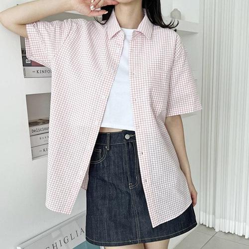 [보슈아][sado]여성 면혼방 시어서커 여름 체크 반팔 남방 셔츠 오버핏 4종 택1 SS1022W