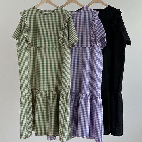 [다잇템][다잇템] 여자 격자 프릴 큰사이즈 귀여운 시어서커 롱원피스_21451908_588872