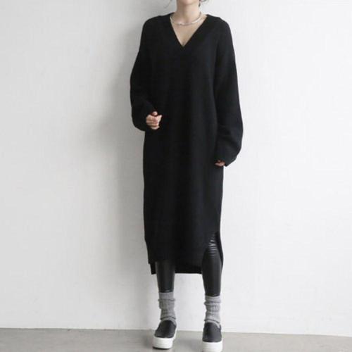 여자원피스 레이어드 루즈핏 겨울 여자 V넥 롱원피스 니트 옆트임