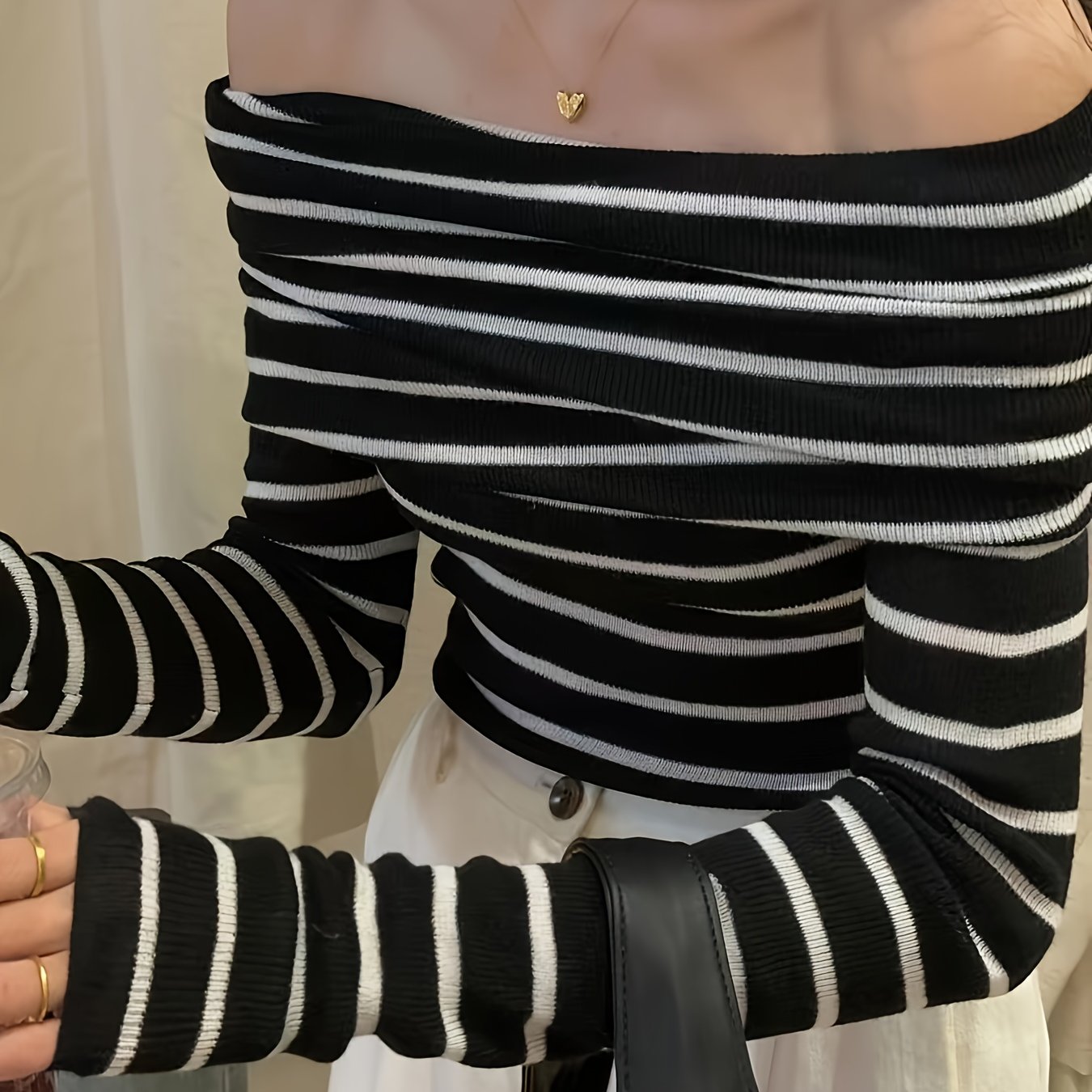 TEMU 여성 시크 오프숄더 긴팔 탑 - 블랙 & , 하이넥, 슬림핏, 봄/가을용 다용도 레이어링, 우아한 캐주얼 스타일, 봄 패션 탑 | 시크 오프숄더 탑 | 여성 탑