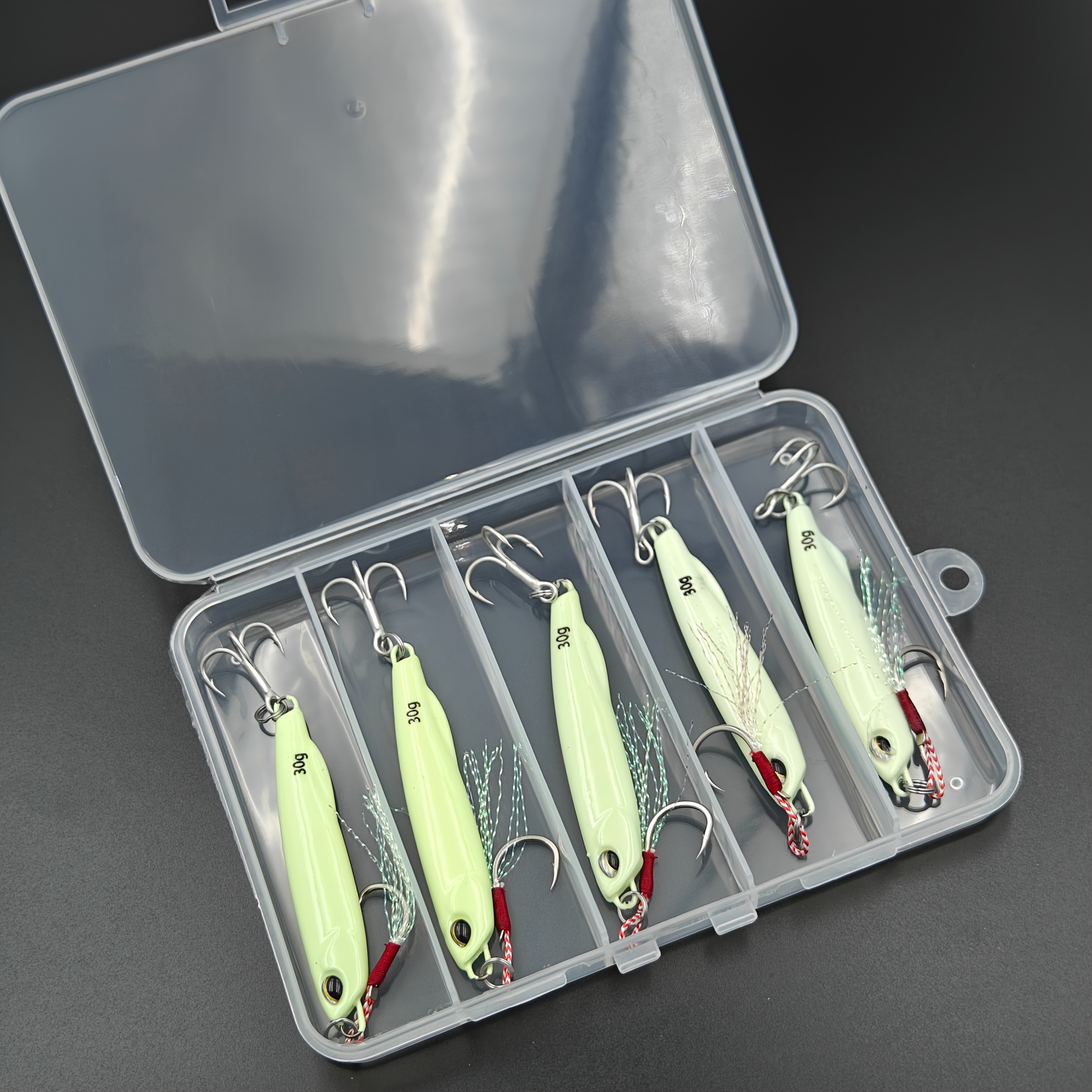 TEMU 플루오레센트 이중 훅이 있는 5개 세트 헤비듀티 10g-60g 발광 금속 싱킹 낚시 추/철판 루어 - 장거리 캐스팅 싱커, 바닷물 및 민물용, 바다 낚시, 트롤링, 지깅용 미끼 (다색)