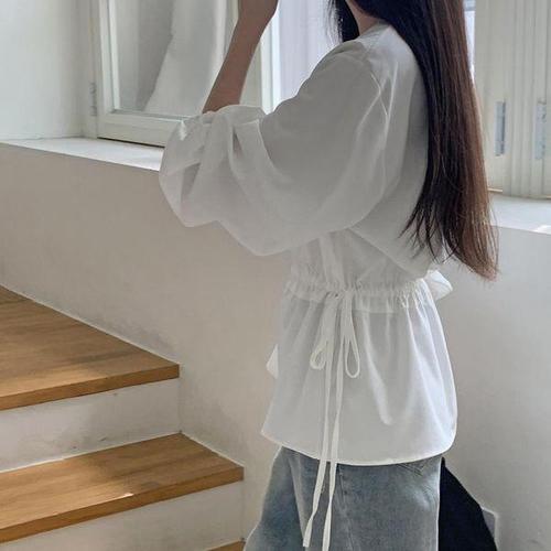 심플 허리 스트랩 랩스타일 볼륨 블라우스 TDN-0131