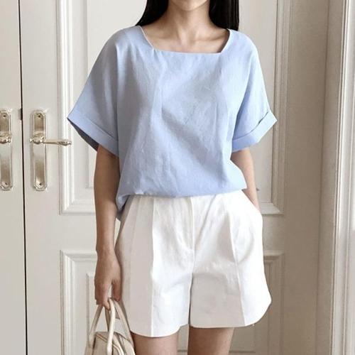 [신상오픈런]|KDH3342|여자 스퀘어넥 심플 캐주얼 무지 반팔 블라우스_18159940_597559