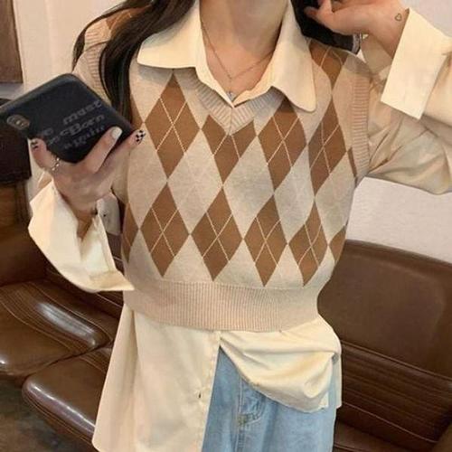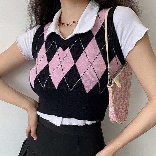 여성 아가일 체크 브이넥 크롭 니트 조끼 베스트 WFL11I2