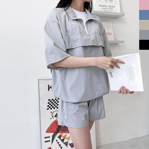 라뷰드 루즈핏 아노락 반집업 반바지 세트 여성 여자 츄리닝 운동복 체육복 추리닝 트레이닝 여름 데일리 캐주얼 반팔 셋트 상하 상하의 바스락 나일론 옷 오버핏 패션 신상