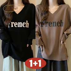 오스틱니 100kg까지 빅사이즈 1+1 2025 여성 봄가을 V넥 심플한 레터링 날염 디자인 감각 날씬해 보이는 외출용 간절기 긴팔 티셔츠