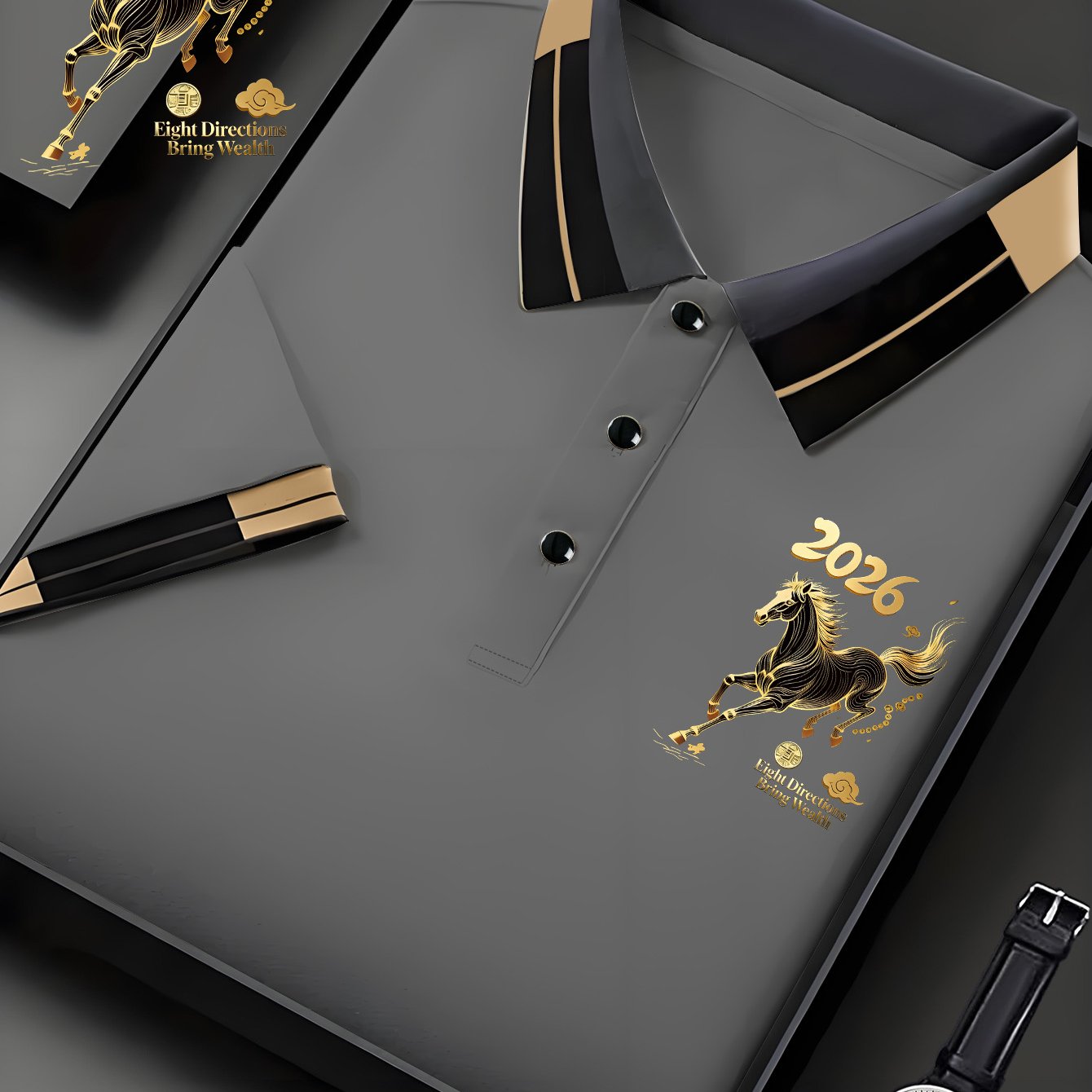 TEMU 말년; 사방에서 부를 상징하는 황금 말; 프린트. 남성용 빠른 건조 반팔 셔츠, 가벼운 셔츠 세탁기 사용 가능, 사계절 착용, 비즈니스/캐주얼/골프웨어 (크리스마스/새해/선물), Ide|골프웨어