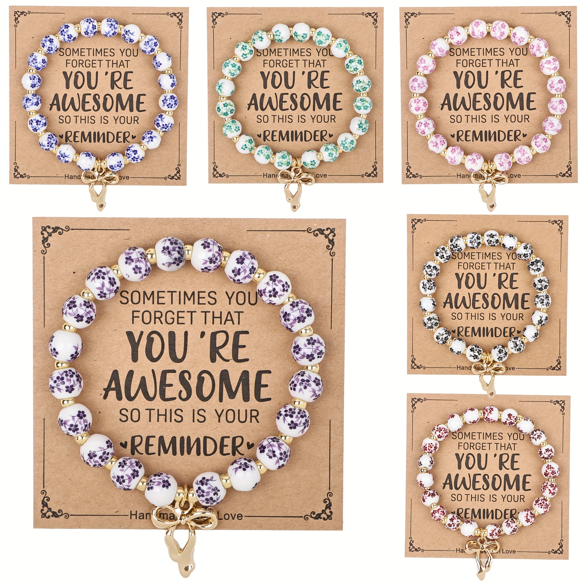 TEMU 6개 세라믹 꽃 팔찌 | 8mm 수제 탄성 비즈, 보우 펜던트, 빈티지 글레이즈, 빛나는 세련된 작은 행복, 6장의 소고기 종이 축복 카드 포함, 여성용 일상 착용 선물 팔찌