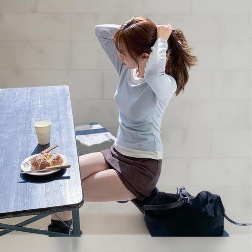 [옷자락] 여성 앙고라 배색 레이어드 슬림 티