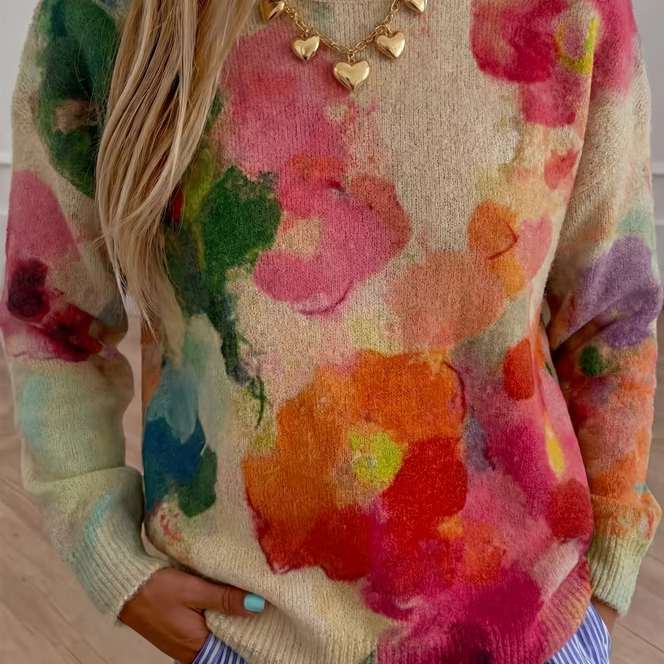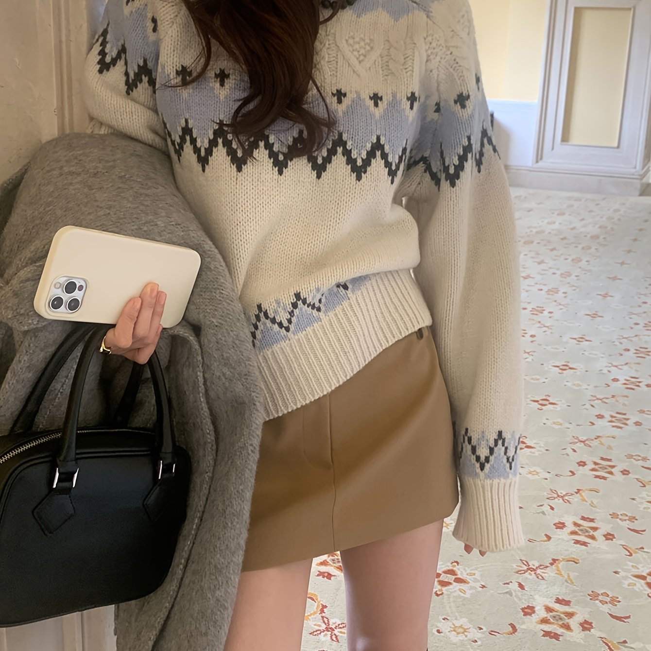 TEMU 여성용 레트로 기하학 컬러블록 스웨터 - 라운드넥, 루즈핏 & 우산형 밑단, 가을/겨울 캐주얼 웨어 소프트 긴팔 풀오버, 어스톤
