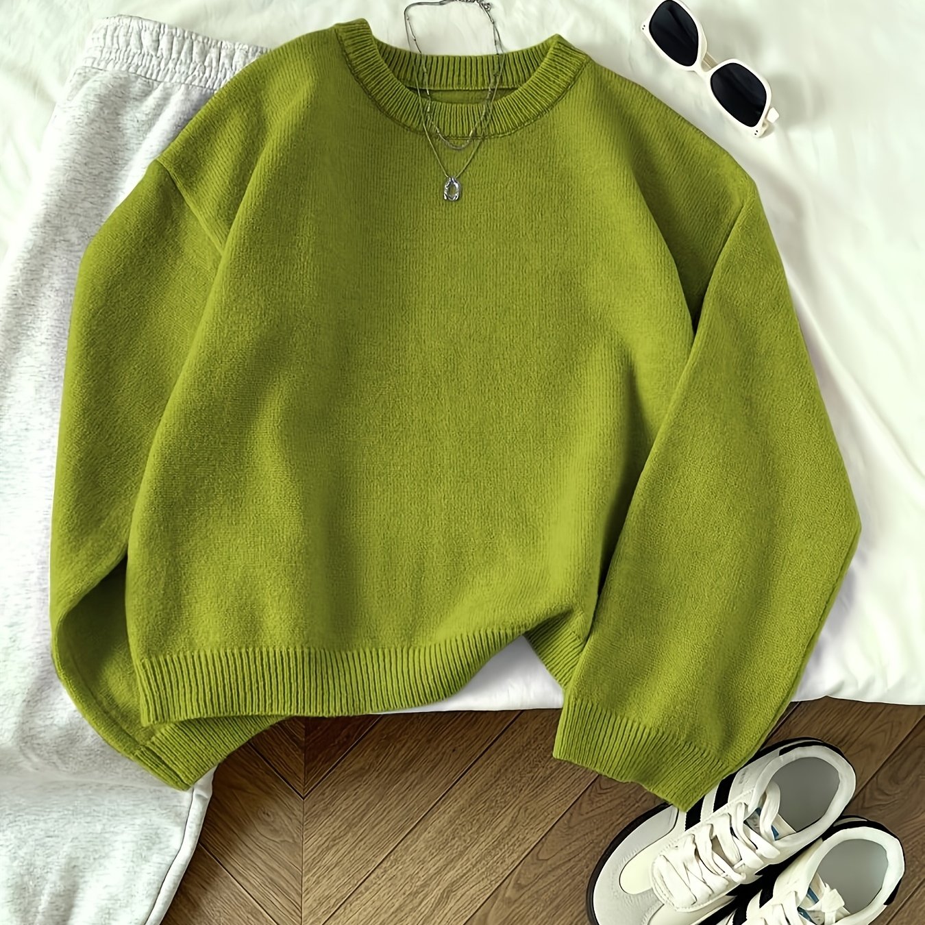 TEMU 2024년 가을/겨울 신상 프렌치 스타일 라운드넥 풀오버 스웨터, 단색, 랜턴 소매, 캐주얼하고 편안한 루즈핏, 스타일리시하고 활용도 높은 디자인, 피부톤 개선