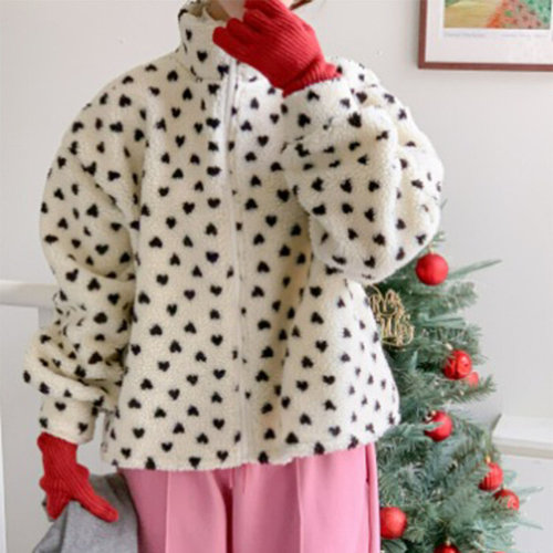 에르디테 / 하트 뽀글이 후리스 양털 덤블 루즈 오버 핏 하이넥 집업 점퍼 2컬러
