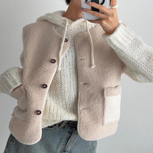 Destijl HC06 품넉넉한 디자인단추 주머니 브이넥 로즈 뽀글이 양털 조끼