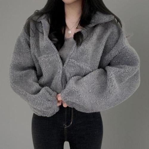 [신상오픈런]여성용 일상 양털 텍스처 하이넥 크롭 집업 재킷