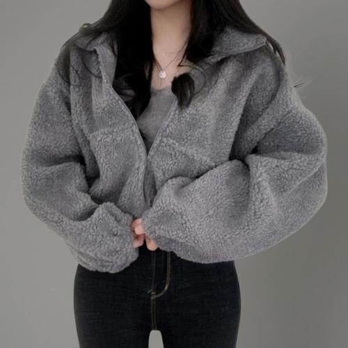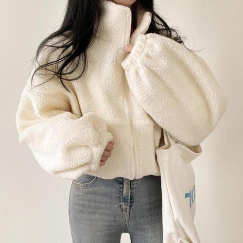 [미라클세븐]여성용 일상 양털 텍스처 하이넥 크롭 집업 재킷
