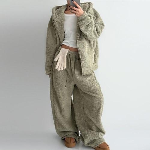 [옷자락]여자 겨울 양털 투웨이 후드집업 루즈 와이드팬츠 세트