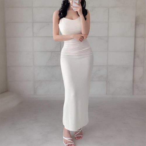 [옷자락] 여자 심플컬러 허리셔링 어깨끈 슬림핏 롱 원피스