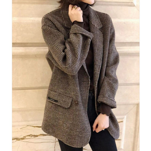 [JHQRLUTF_4B]체크 코트 롱코트 오버핏 모직 롱 외투 셔츠