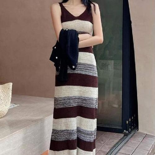 [엄지척]갈색 계열 배색 포인트 민소매 니트 원피스 해외여행_19952031_667501