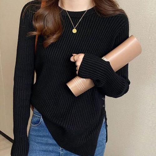 [에이치플러스몰]라운드넥 니트 긴팔 티셔츠 언발란스 옆절개 단추