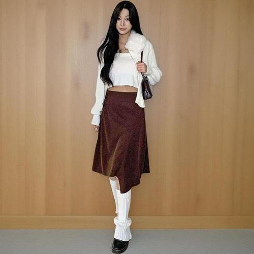 [신상오픈런]여성 언발란스 단추 포인트 코듀로이 미디 스커트