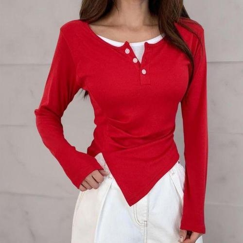 [옷자락]여성 언밸런스 브이넥 슬림 롱스트랩 골지 긴팔 티셔츠