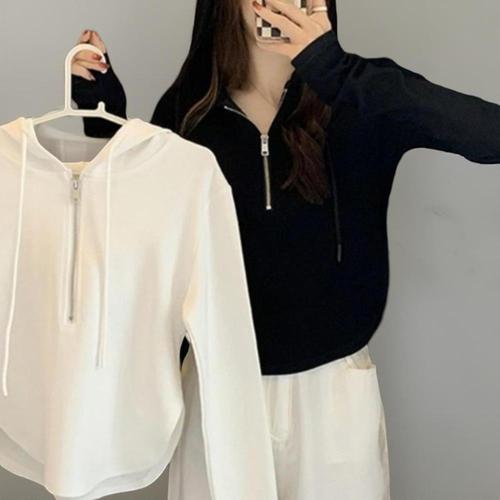 여성 언발란스 하프집업 롱슬리브 흰색 티셔츠