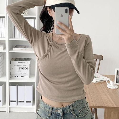[옷자락] 여자 언발 레이어드 버튼 홀터넥 롱슬리브 크롭 티셔츠