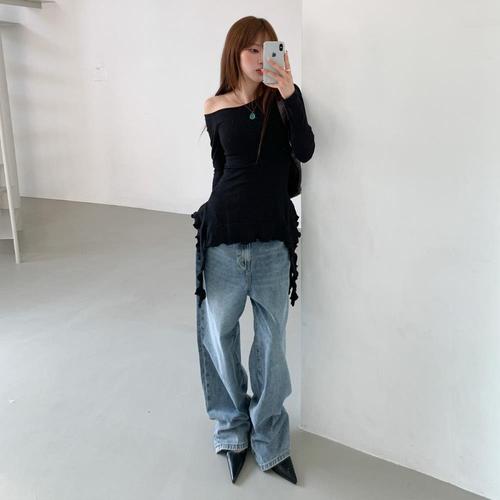 여성 롱슬리브 언발 볼드숄더 프릴 골지 티셔츠