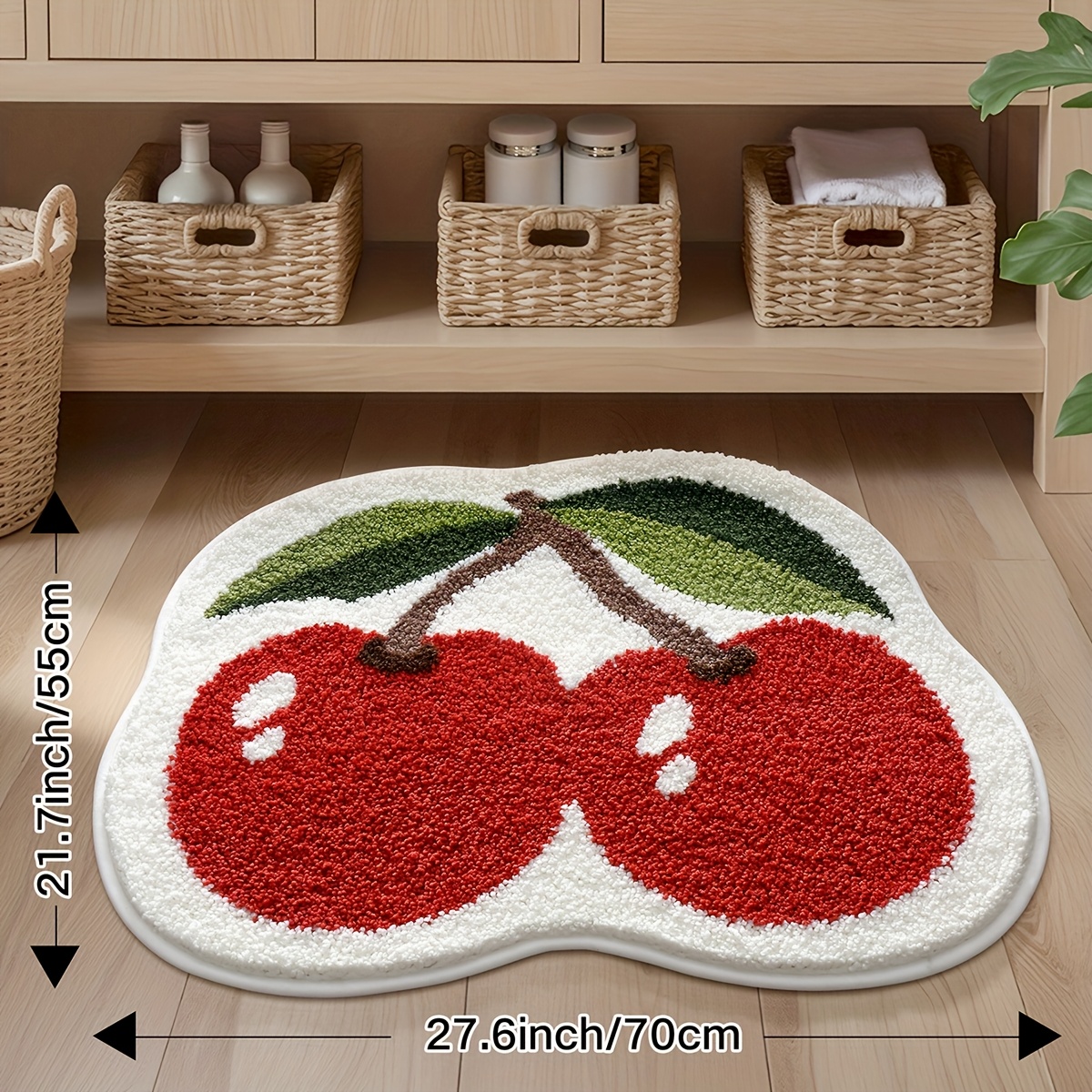 TEMU 1개 다장 체리 과일 패턴 욕실 매트 - 매우 부드러운 흡수성 미끄럼 방지 욕실 러그, 빨간 체리 & 녹색 잎 디자인, 플러시 폴리에스터, 세탁기 사용 가능