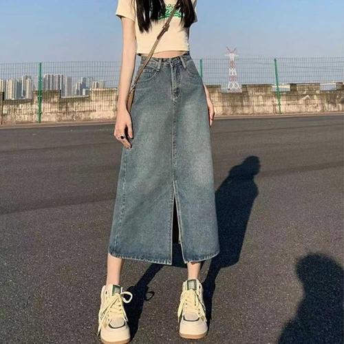 여자 진청 워싱 슬릿 논스판 에이라인 롱스커트