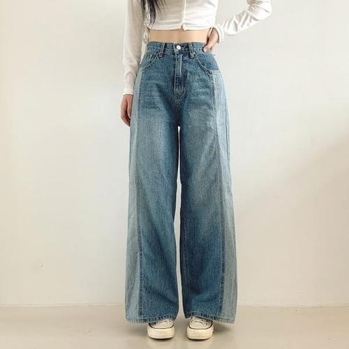 [문에이블]문에이블 여자 여성 봄 가을 와이드핏 배색 뒷밴딩 중청 진청 청바지 데님 팬츠
