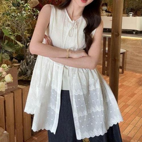 패션 보우 레이스 업 셔츠 여성 코튼 린넨 속이 빈 민소매 Pleated 블라우스 여성 2024 여름 새 캐주얼 레이디 화이트 탑스