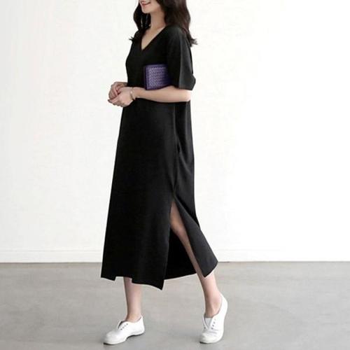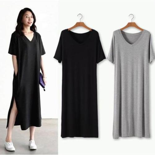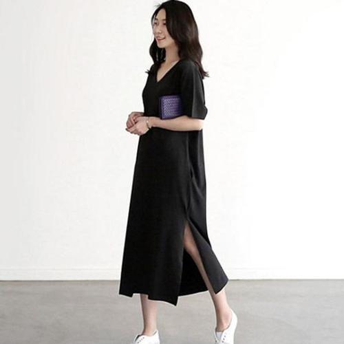 [오너클랜]인기상품 여자 브이넥 옆트임 무지 롱 심플 원피스 반팔 캐주얼 [WC2D95A_250917]