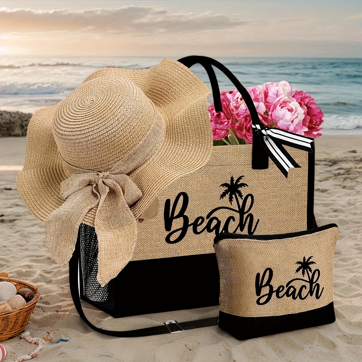 TEMU 여성용 비치 핸드백, 패셔너블한 "비치" 패턴과 여성용 비치 모자 포함, 해변 휴가 및 야외 결혼식에 적합. 여성, 어머니, 학생, 학교 복귀를 위한 훌륭한 선물