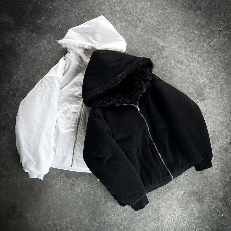 후드가 달린 인조 모피 재킷 지퍼 솔리드 양면 착용 블랙 숏 플러시 코트 따뜻하고 두꺼운 인조 토끼털 재킷 플러피 캐주얼