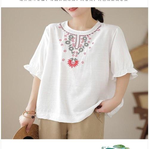 S9940 루즈핏 앞 자수 여름 라운드 반팔 블라우스 WFL8DEG