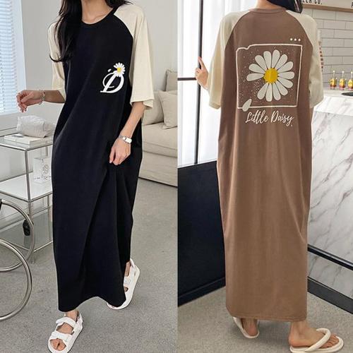 [유야]여성 나그랑 배색 면 라운드 반팔 롱 원피스 -FOP0053- 여름