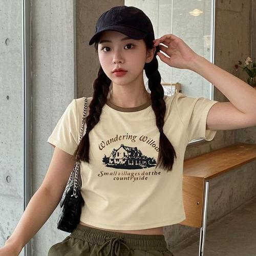 [셀러허브_여성트랜드패션]ONM 여성티셔츠 여름 티셔츠 프린팅 세미 크롭 반팔티